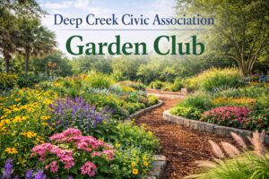 The mission of the Deep Creek Civic Association’s Garden Club, a non-profit organization, is to assist in the creation and maintenance of Deep Creek’s common areas while supporting the protection and conservation of local natural resources. We also seek to promote interest and education in gardening, landscape design, environmental awareness, and horticultural topics through meetings, field trips, and seminars. In addition, the Garden Club supports Deep Creek residents by sharing information and practical suggestions to encourage thoughtful landscaping and community pride.